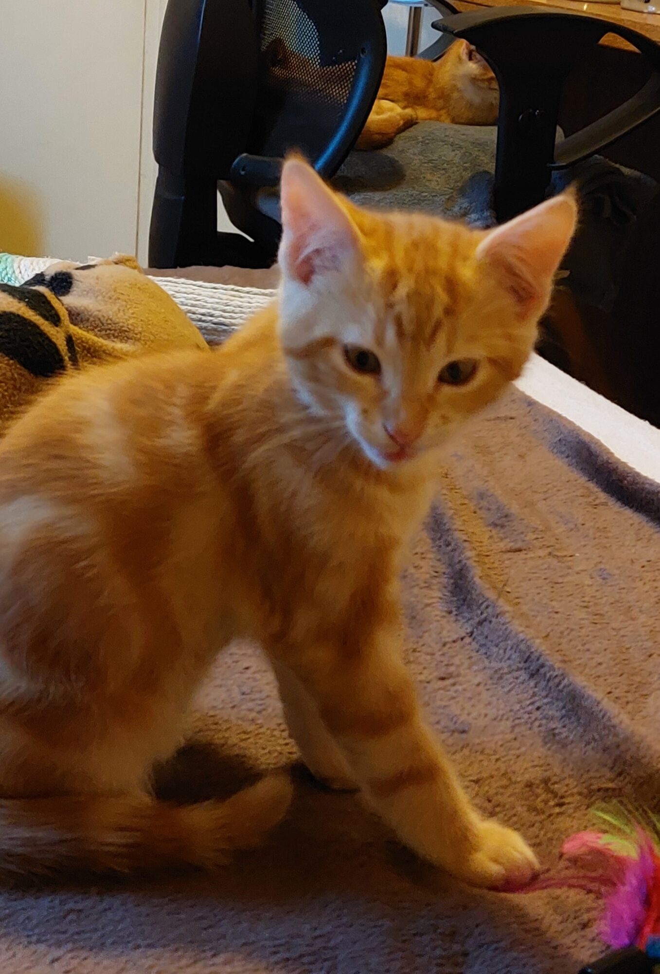 Aujourd’hui, Bambou se révèle être un chat joueur, câlin et plutôt posé. Très proche de l’humain, il apprécie la présence et les moments partagés, tout en sachant aussi se montrer plus calme. Il aime jouer, mais prend également le temps d’observer ce qui l’entoure. Une fois en confiance, il profite volontiers des câlins et sait se transformer en petite machine à ronrons. En télétravail, Bambou adopte une approche beaucoup plus “méthodique” que ses frères : il peut passer de longs moments à observer attentivement le curseur de l’écran, comme s’il tentait de comprendre les mystères de l’informatique moderne. Sa participation aux réunions en visio est également discrète mais reconnaissable : une queue qui traverse parfois l’écran, il participe à sa manière aux échanges professionnels. Bambou est un compagnon calme, attentif et plein de douceur, qui apporte une présence apaisante au quotidien.